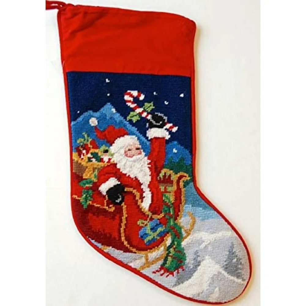 Festive Santa Red Sleigh Wool Needlepoint Christmas Stocking